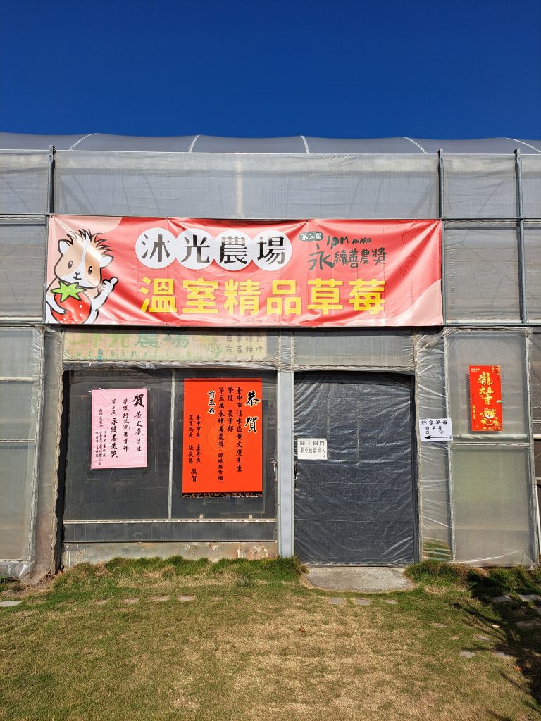 位於台中清水的溫室草莓農場,裡面可採草莓,分為兩個區塊。一個溫室是綜合草莓,採多少秤重後計價。另一個溫室是「日本紅顏草莓」專區,是以盒計價,又依採收的草莓大小價格不同。採收區有圖片提供遊客參考大小,摘採的時候盡量採收大小差不多的草莓較好計算價格。也可直接購買特殊的白草莓(白草莓目前不開放遊客自行採收),價格最高。不過草莓成熟情況不一定能夠採收,預計前往的話最好前一天先致電老闆確認是否開放。