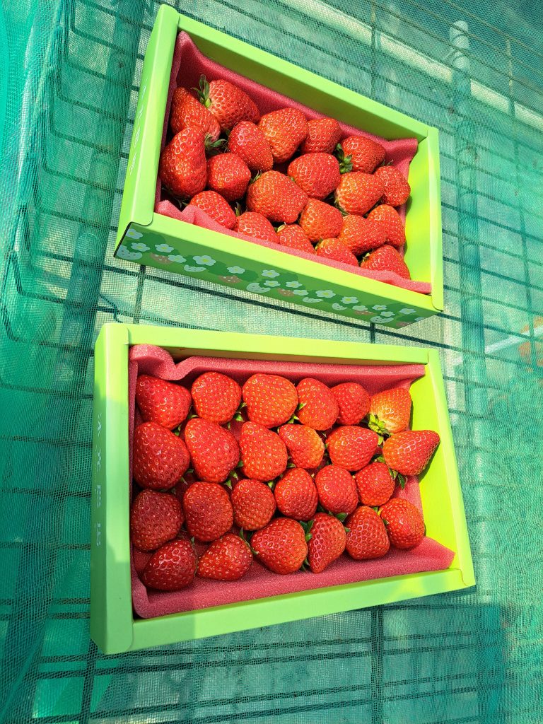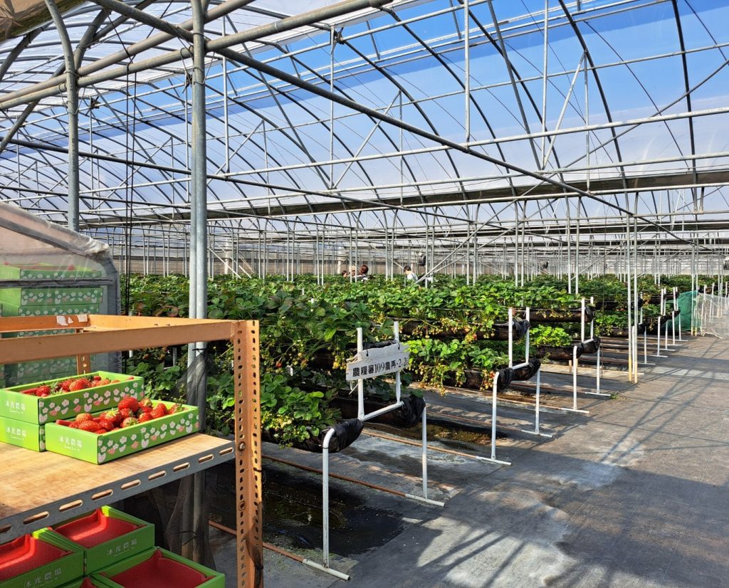 結帳的地方在綜合草莓的溫室,工作人員會再蓋上透明蓋子包裝,這邊也可以直接購買草莓。綜合草莓的盒子設計和紅顏不太一樣,兩種都蠻可愛的。在這邊也有座位可以直接吃採完的草莓!(農場規定不行邊採邊吃哦!)為了防止昆蟲進入草莓園,出入溫室都有兩道門。不過還是難免有一些草莓有咬痕,採收時再注意即可。工作人員也會幫忙檢查。兩個溫室雖然都很大,但開放的區域都有限制,可能也是避免一下子草莓就被採完。整理來說體驗相當不錯!